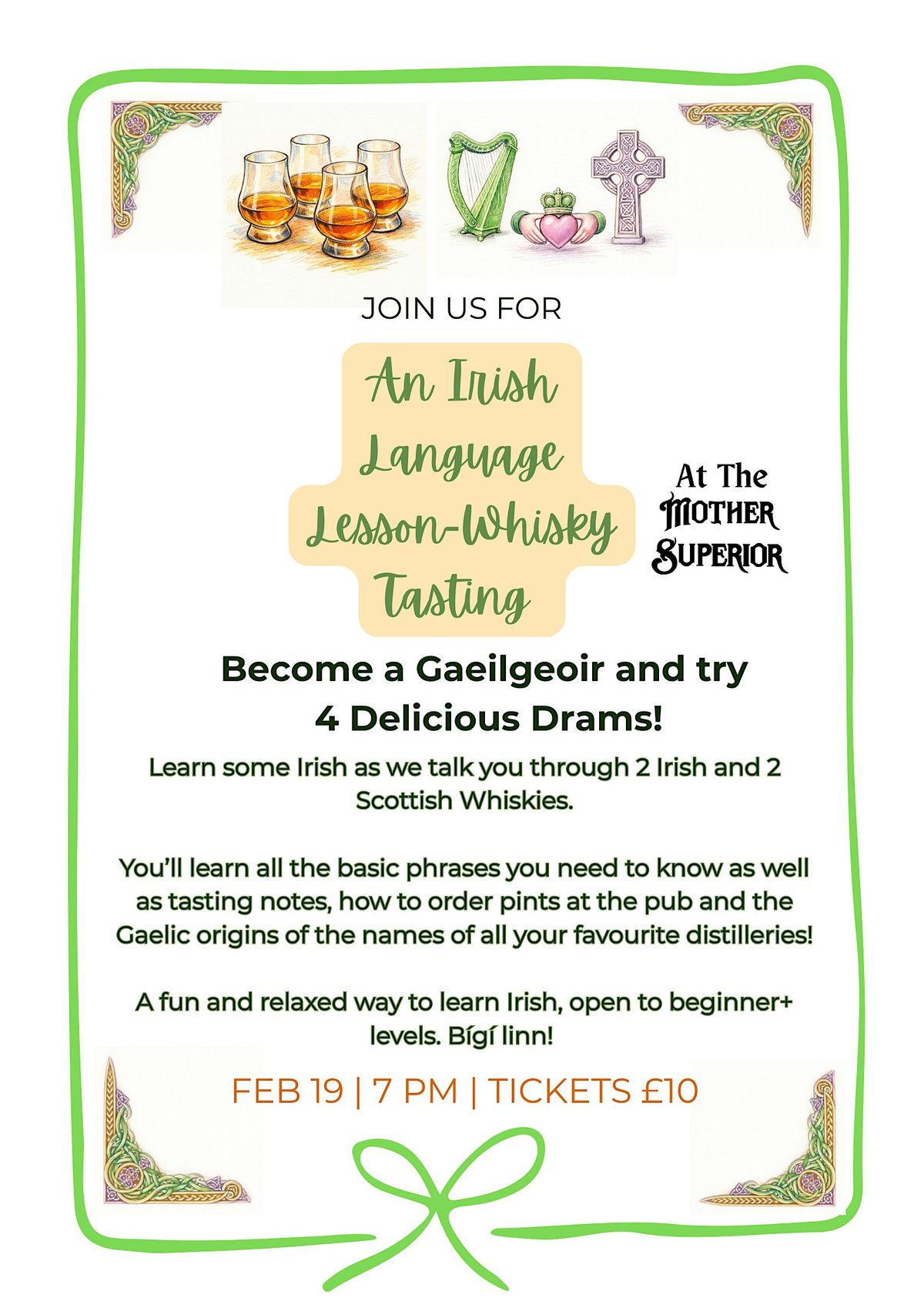 This will be a fun event, open to all with a thirst for knowledge and/or whisky! You’ll learn some Irish while tasting 4 delicious drams (and we promise it won’t be anything like it was at school!)