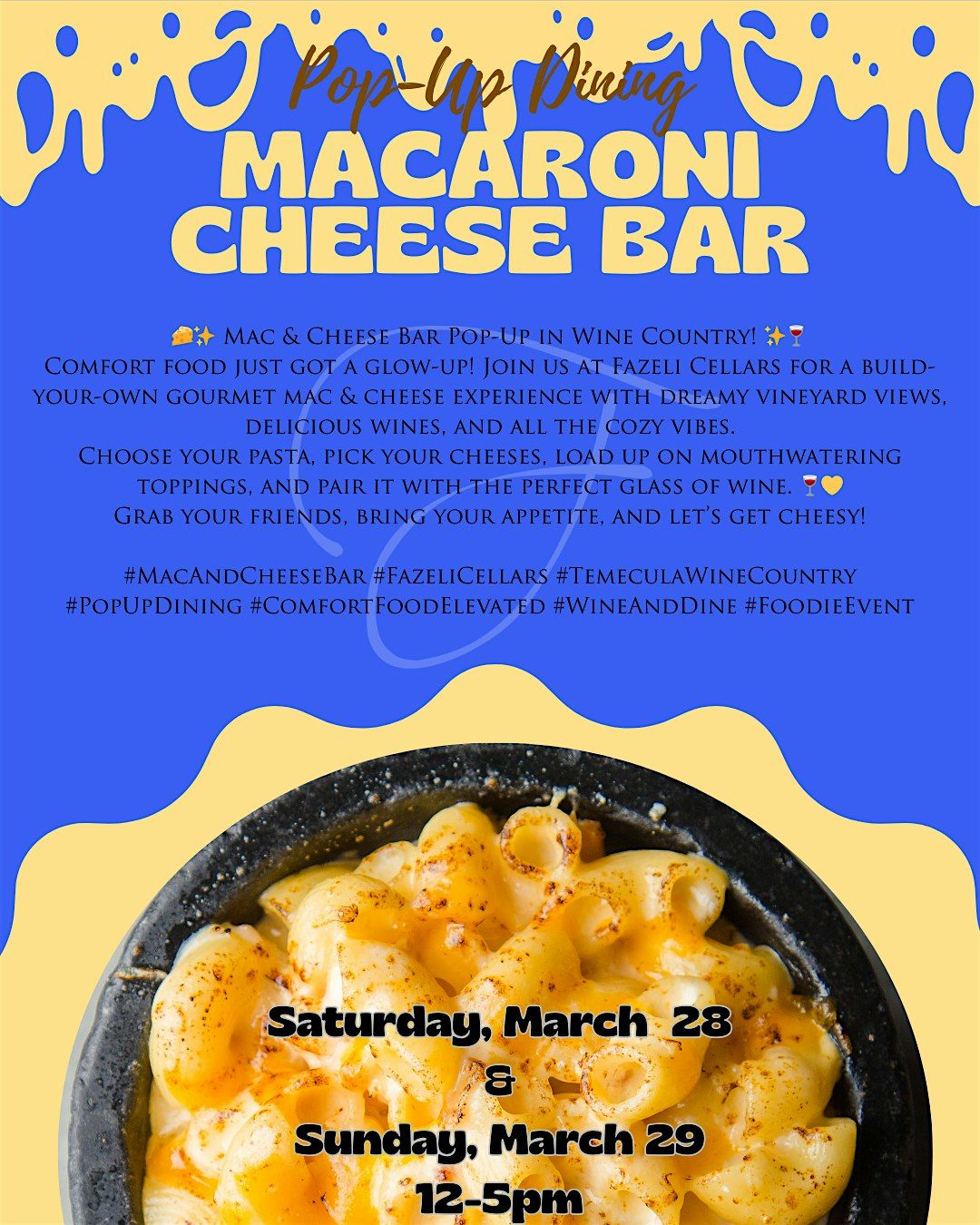 Get ready for the ultimate comfort-food glow-up in the heart of wine country! Join us on the stunning terrace at Fazeli Cellars for a mouthwatering build-your-own Mac & Cheese experience—where creamy, cheesy goodness meets breathtaking vineyard views and your favorite boutique wines.