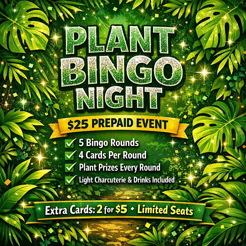 Plant Bingo Night! 5 rounds, 4 cards per round, plant prizes, light charcuterie and drinks. Classic bingo with plant fun. Limited seats!