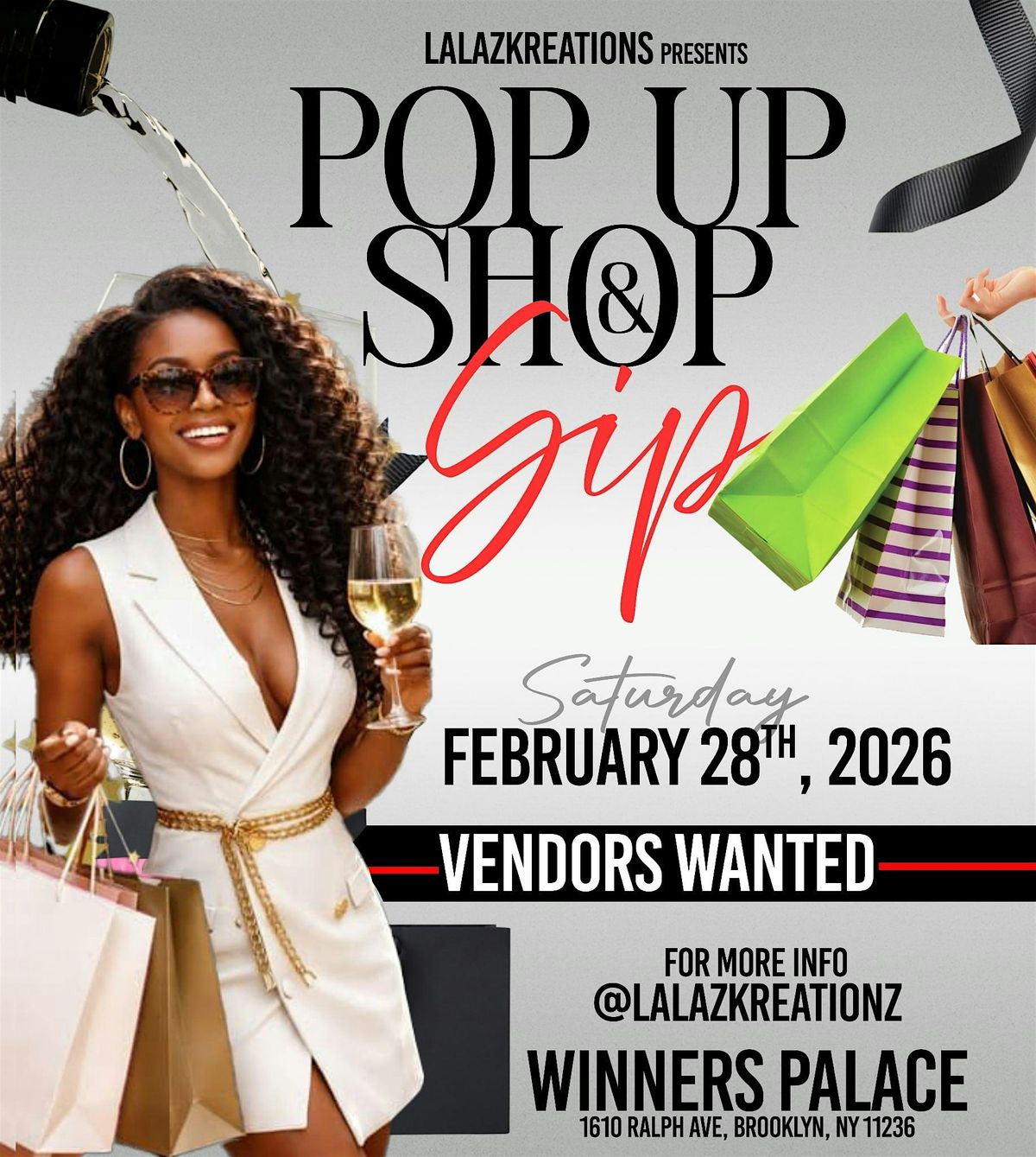 Welcome to the POP UP SHOP & SIP event at Winners Palace Event Hall! Join us on February 28, 2026 at 1:00 PM (Eastern Time) for a night of shopping and sipping. Browse through unique pop-up shops while enjoying delicious drinks. Don't miss out on this exciting opportunity to discover new products and have a great time with friends. See you there!