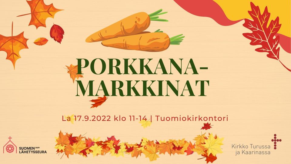 Tervetuloa perinteisille Porkkanamarkkinoille nauttimaan syyspäivästä ja ostamaan satokauden tuotteita. Tuotteita myyvät muun muassa Turun seudun seurakuntien vapaaehtoiset. Markkinoiden tuotto menee Suomen Lähetysseuran Tasaus-keräykselle.Markkinoilla SLS:n Katri Niiranen-Kilasin kertoo työstään Tansanian kirkon Makumira-yliopistossa. Lisäksi esiintyy Sumu-yhtye.