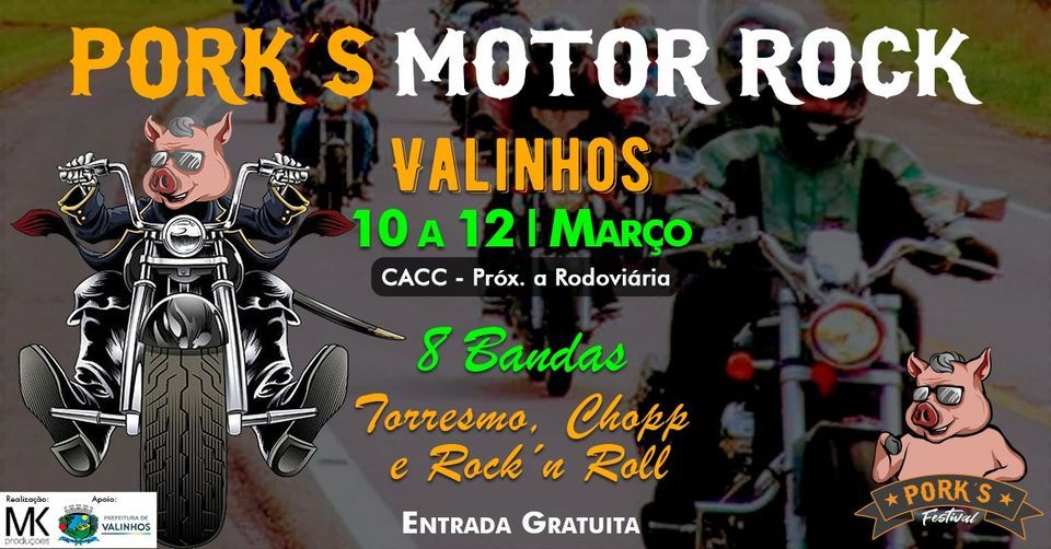 Muito Rock'n Roll, Chopp e Comida Boa!Este é o PORK'S MOTOR ROCK edição Valinhos - uma FESTA com uma ampla Praça de Alimentação com muito torresmo e carne suína, chopps de diversos tipos, cervejas e muito ROCK'N ROLL?