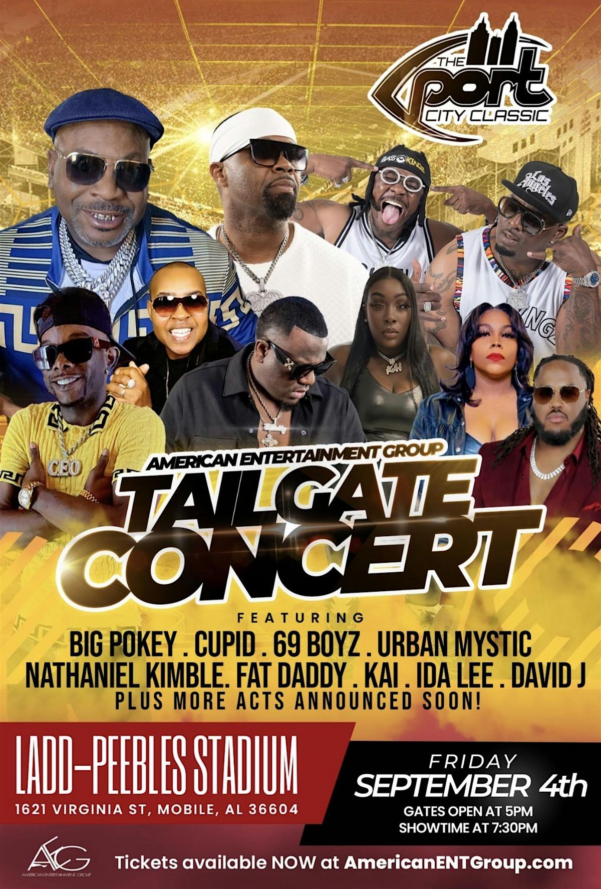 Come get your Port City Classic Party on with us at the Southern Soul Tailgate Jam starring TUCKA, CUPID, MIKE CLARK JR., FAT DADDY, MR. CAMPBELL, TOY TOY, DAVID J & DJ TRUCKER on Friday, November 14, 2025 at Ladd-Peebles Stadium. This event is BYOB and you must bring your own lawn chair. VIP also available. Gates Open at 6pm. Show Starts at 8pm. Get Your Tickets online at AmericanEntGroup.com.