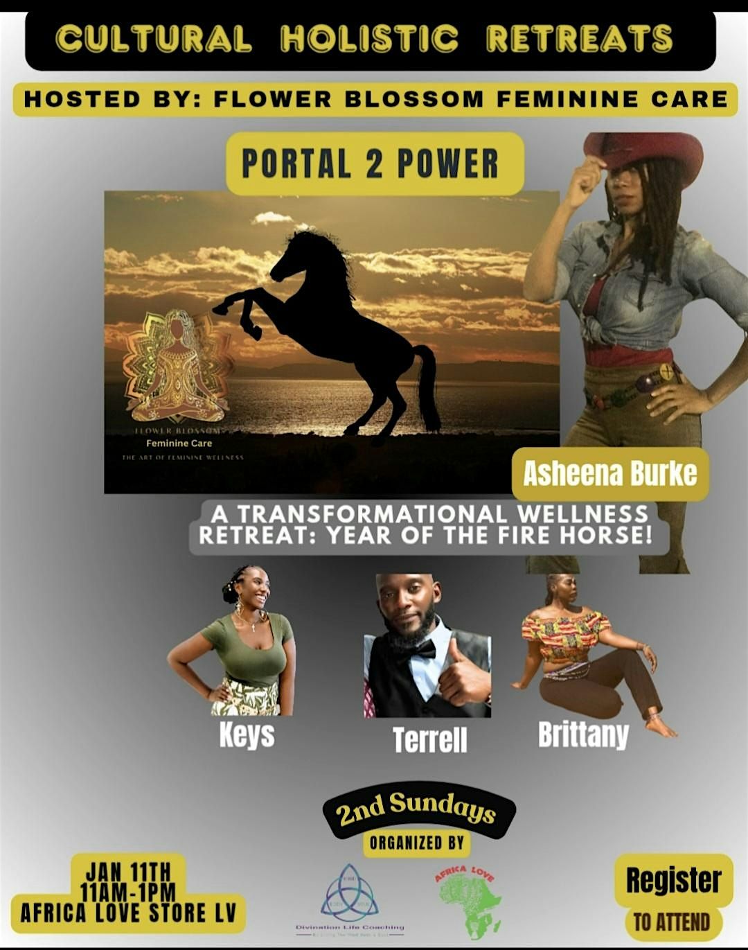 Experience breathwork, sound healing, water dissolution ceremony, divine feminine and masculine teachings, Kemetic Yoga, and create your personal Power Portal Card to carry through the year.