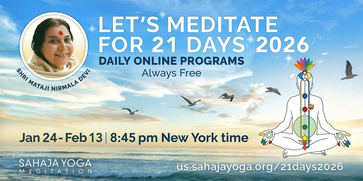 This spiritual meditation awakens inner energy (Kundalini), bringing balance, peace, and joy within, while creating a clearer perception free from unnecessary thoughts. The 21-day course begins an ongoing journey with an online community of Sahaja Yoga meditation practitioners. Classes are offered throughout the year for those who would like to go deeper and continue their spiritual growth.