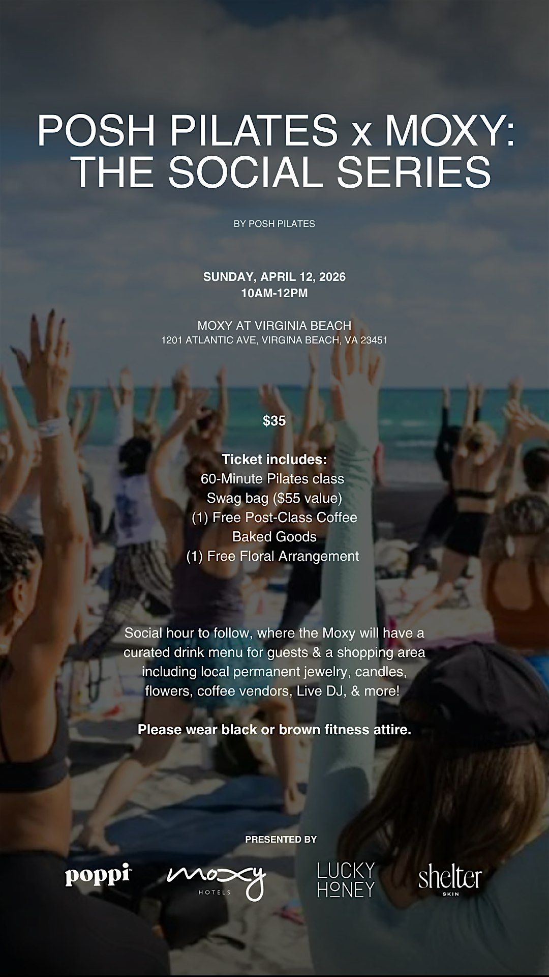Posh Pilates at Moxy is a curated experience designed to bring people together through movement, music, and shared moments. Your paid ticket starts with a high energy DJ & instructor led mat Pilates class, a swag bag, branded water bottle, coffee, snack box, flower arrangement from the bloom bar, discount for the next activation, backdrop with our onsite photographer, and access to purchase items at the post social hour with dainty & dazzled Permanent jewelry, candles by soy vida , and a curated drink menu by Moxy (mocktail & cocktails)