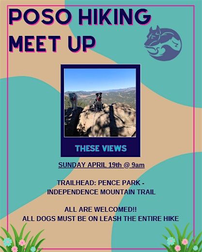 April 19th : 9am meet at parking lotIndependence Mountain Trailhead at Pence Park2 miles long, 800 ft elevation gainOpen to all levels of energy levels and training levelsDogs must stay on leash the entire hike