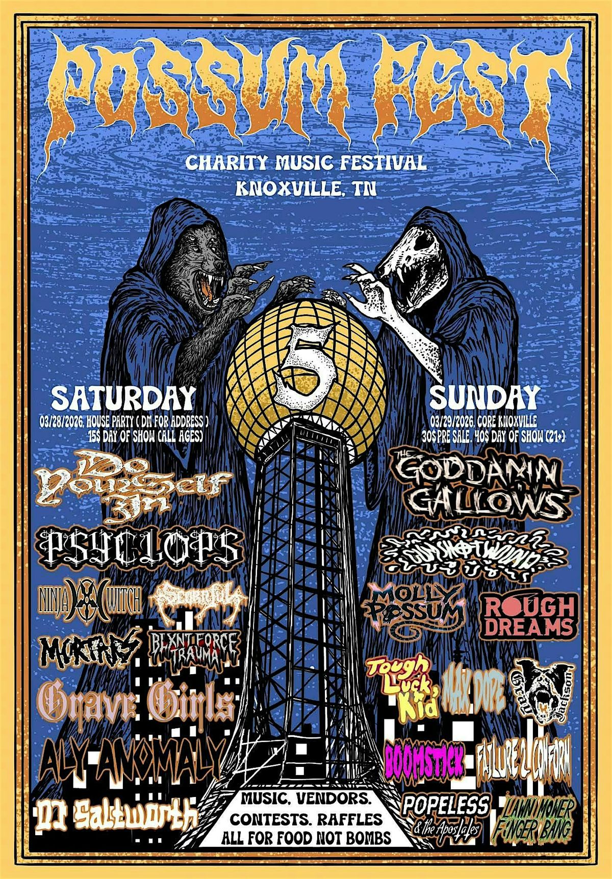 Black Hearts Productions and Molly Possum are proud to host PossumFest 5, this year raising money for Food Not Bombs. These tickets are for Day 2, which will be hosted at Core and Headlined by legends of punk, psychobilly, and bluegrass The Goddamn Gallows. Also returning for Day 2 are the charity raffle and the yearly Possumfest Hotdog Eating Contest.