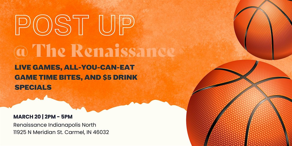 Join us at the Renaissance Indianapolis North Hotel for our Post Up Event, the ultimate college basketball watch party! Catch all the live games on big screens while enjoying all-you-can-eat game-time bites to fuel your cheering. Sip on $5 drink specials as you celebrate every buzzer-beater in a lively, social atmosphere—perfect for friends, fans, and foodies alike!