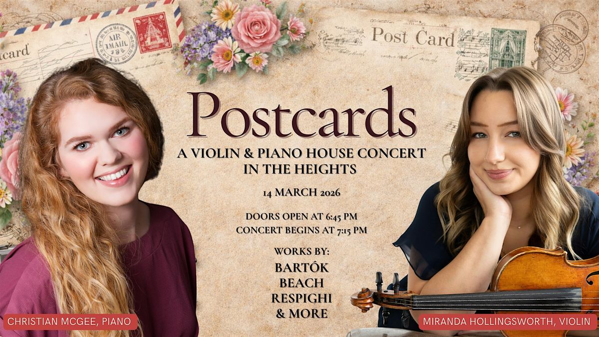 Join us for Postcards, an intimate evening of violin and piano music presented in a relaxed house-concert setting in Houston’s Heights neighborhood. Enjoy exceptional live performance alongside food, drinks, engaging stories, and great company.