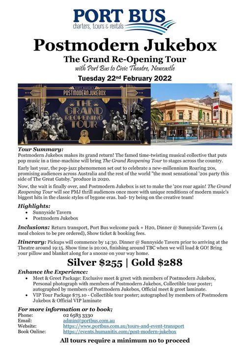 Postmodern Jukebox The Grand Re-Opening Tour with Port Bus to Civic Theatre, Newcastle.Tuesday 22nd February 2022