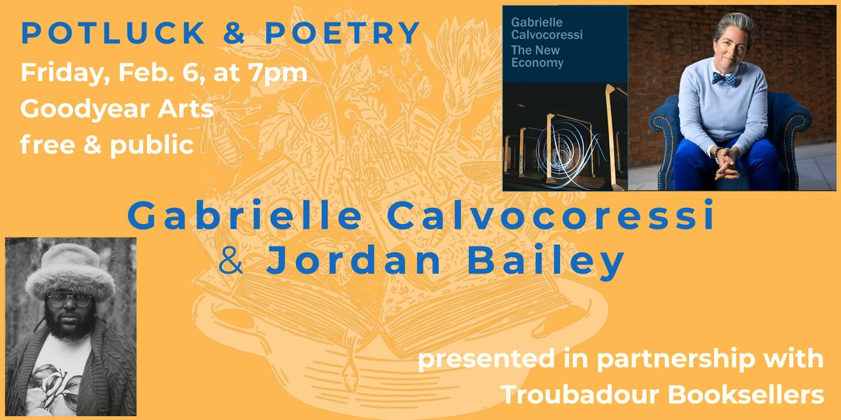 Join us for a poetry reading & community potluck featuring Gabrielle Calvocoressi & Jordan Bailey. Celebrate Calvocoressi, whose collection, The New Economy, was a Finalist for the 2025 National Book Award in Poetry, and Bailey, who was just named the 2026 GoodLit Fellow.