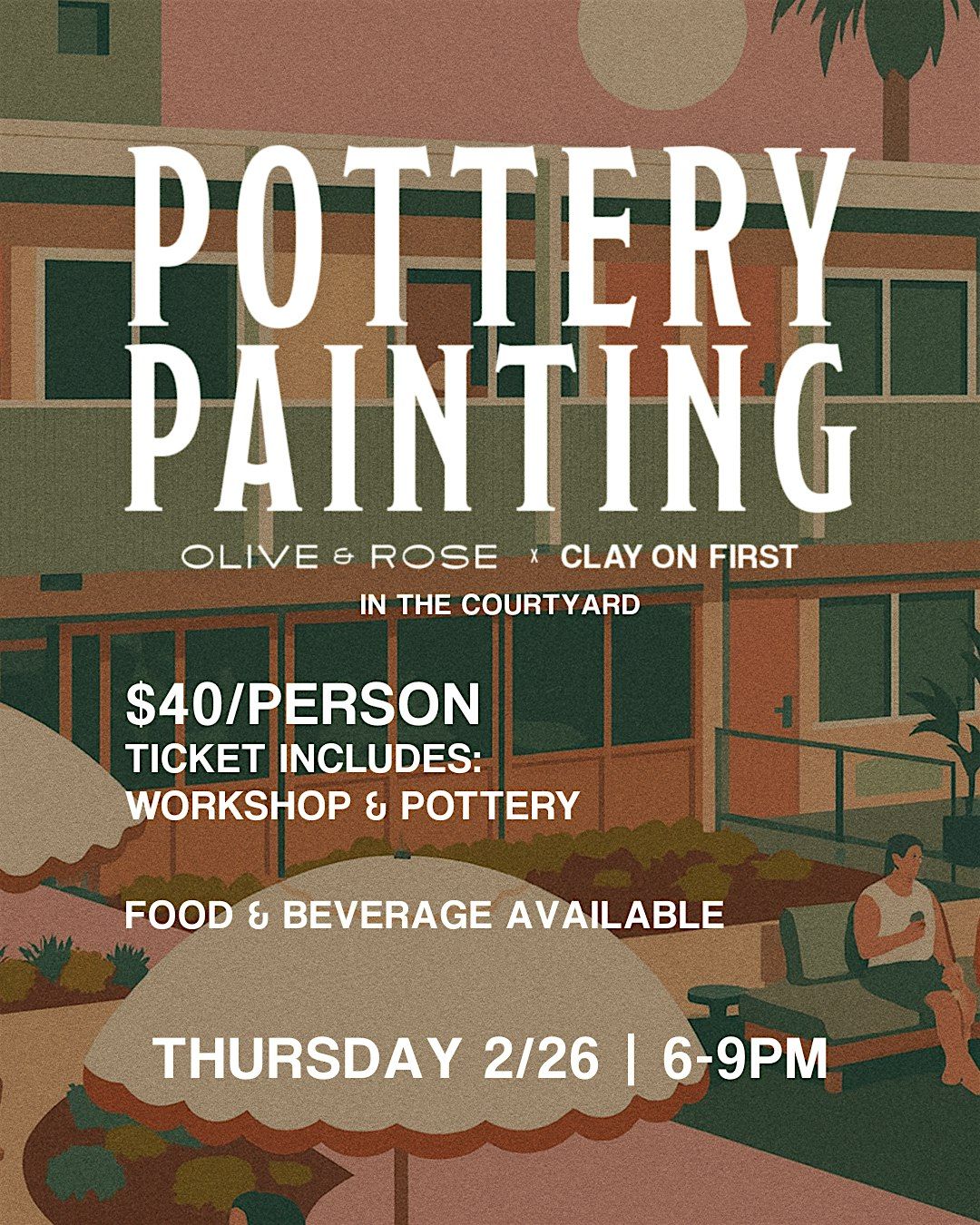 Welcome to Pottery Paint & Sip in the courtyard at Olive & Rose! Join us for a fun-filled evening of creativity and relaxation. Unleash your inner artist as you paint your own pottery masterpiece while enjoying a glass of your favorite drink. This in-person event is the perfect way to unwind and socialize with friends or meet new people who share your love for art. No experience is necessary - our expert instructors will guide you every step of the way. Come sip, paint, and create memories that will last a lifetime!