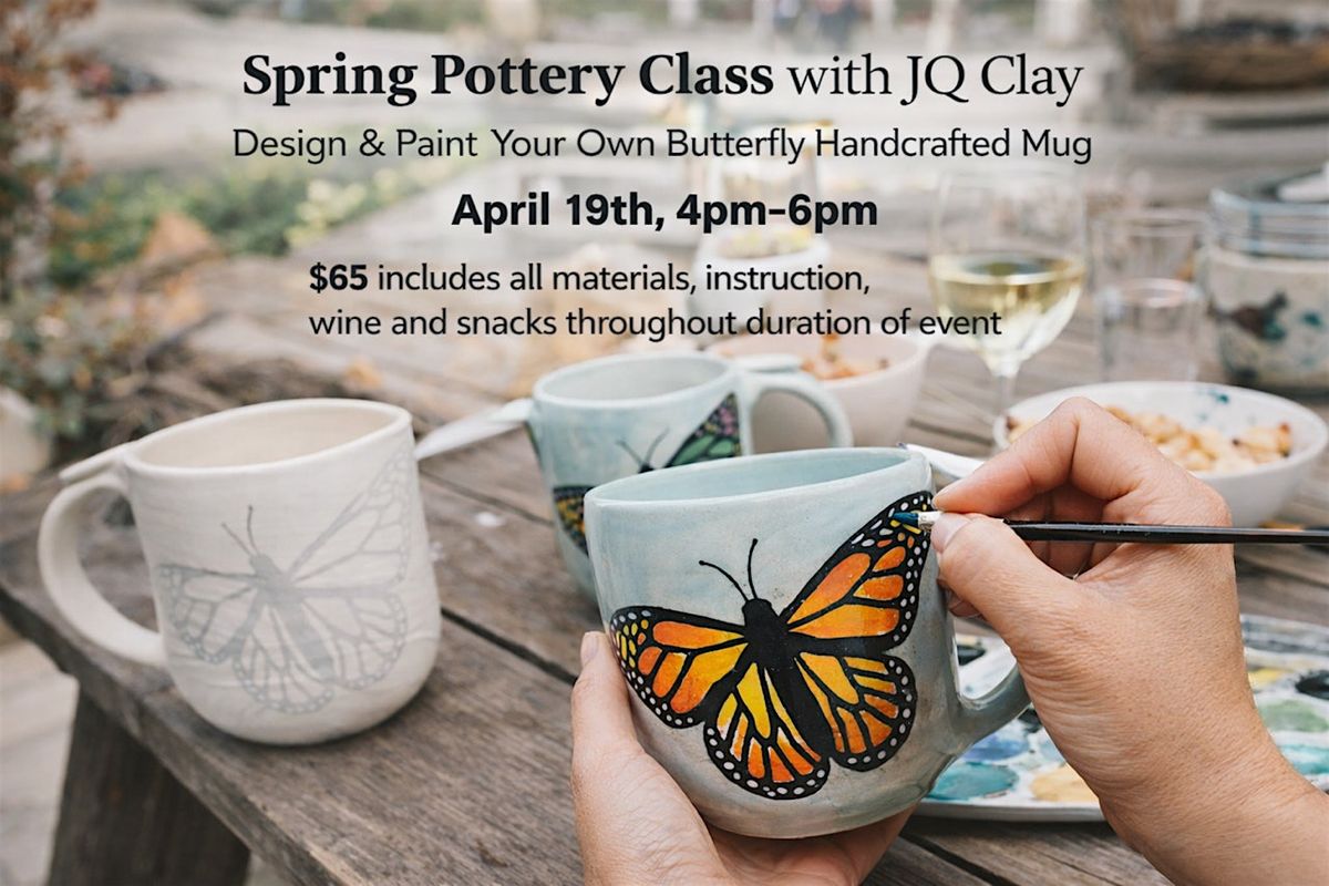 Join JQ Clay on April 19th from 4pm–6pm for a hands-on pottery experience where you’ll design and paint your very own butterfly mug. Each mug is handcrafted and ready for you to personalize with your own spring-inspired butterfly design.