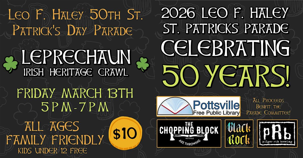 March 13th 2026 from 5PM-7PM there will be an all ages friendly Irish Hertiage Crawl throughout beautiful Downtown Pottsville! All revenue from this event will go to the St Patrick Days Parade funds which hosts the cities annual parade and is celebrating their 50th year of the parade this year!