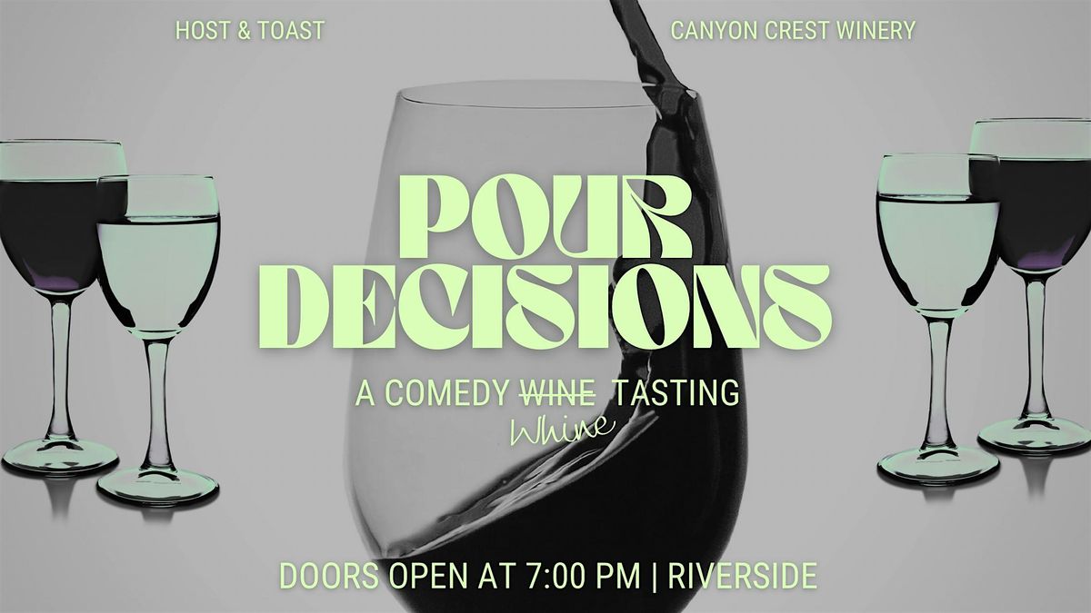 Welcome to Pour Decisions a Comedy Wine Tasting event at Canyon Crest Winery! Get ready for a night of laughter and delicious wine on March 19, 2026 at 7:00 PM (Pacific Time). Join us for a unique experience where you can taste a variety of wines while enjoying hilarious comedy performances. It's the perfect blend of fun and relaxation. Don't miss out on this unforgettable evening! See you there!