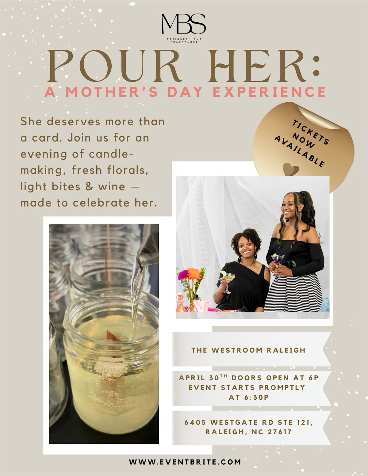 Your candle will need approximately 30 minutes to harden after pouring — the perfect amount of time to arrange your florals, sip your wine, enjoy light bites, and soak in the energy of a room full of people celebrating the women they love.