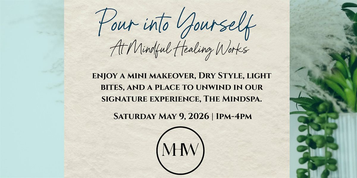 Join us at Mindful Healing Works on Saturday, May 9th from 1:00 PM - 4:00 PM for Pour Into Yourself, a curated afternoon of beauty, nourishment, and deep rest designed to help you feel refreshed, radiant, and reconnected to yourself.