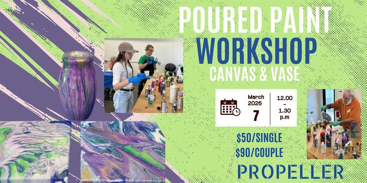 Poured paint is back at Propeller! In this hands-on workshop, participants will learn the basics of poured paint, including techniques for layering, color mixing, and creating unique effects. Each participant will create two custom pieces—a poured paint vase and an 8 in. by 8 in. canvas—to take home. This relaxed, creative experience is designed for all skill levels, and all ages are welcome. No prior art experience is needed—just come ready to have fun and get a little messy.