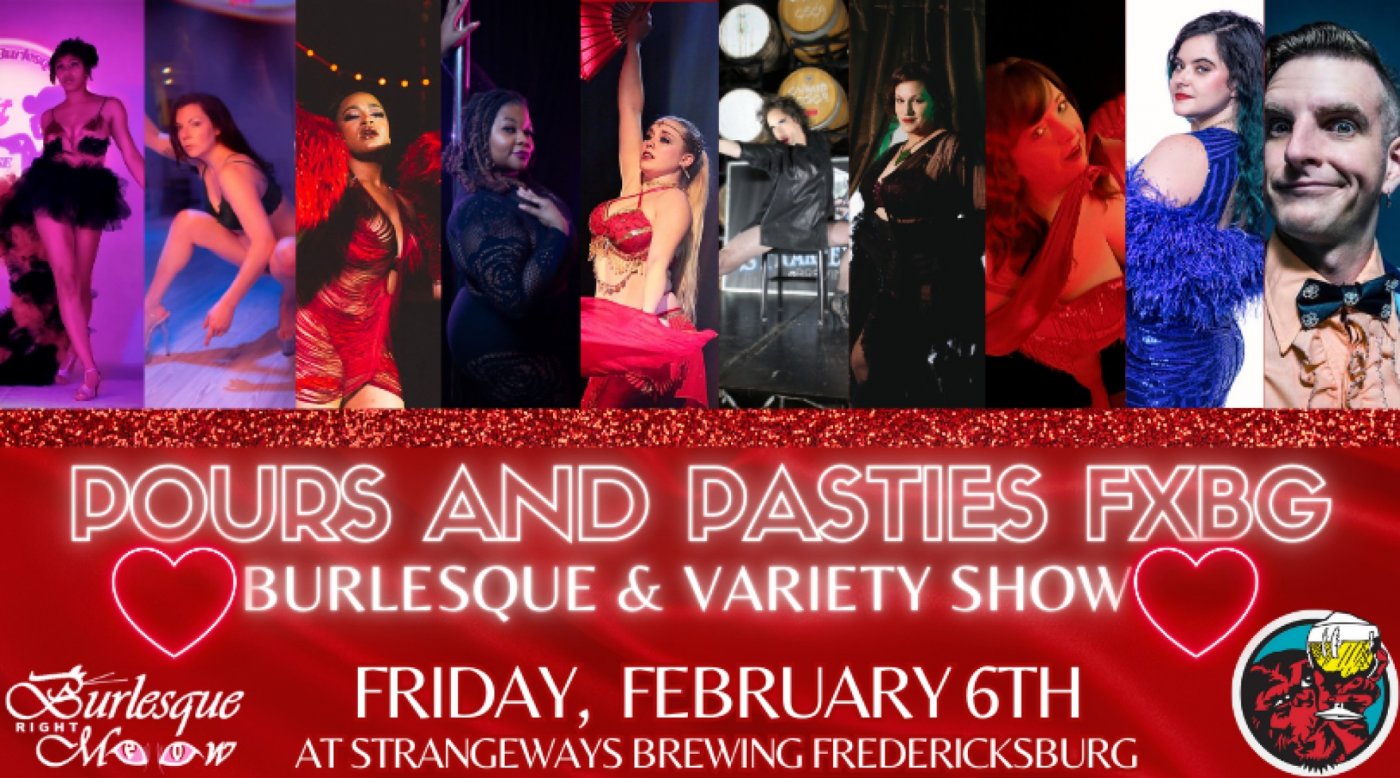 Pours and Pasties Burlesque & Variety Show returns to Strangeways Brewing Fredericksburg on Friday, February 6th for a night of dazzling performances, playful allure, and jaw-dropping talent. Sip on Strangeways’ iconic brews while you enjoy an evening filled with laughs, flirtation, and unforgettable entertainment.