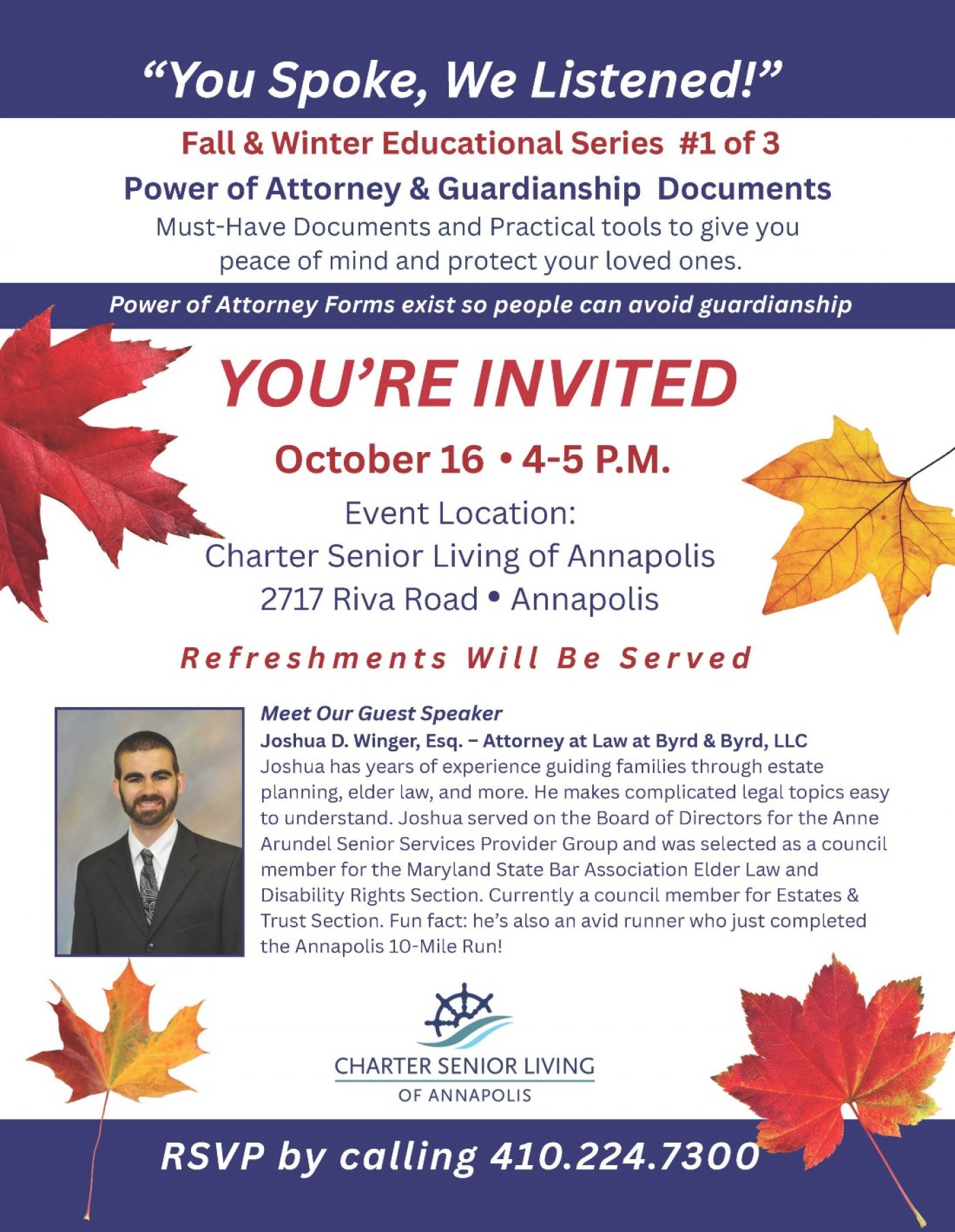 ⨠Discover the significance of Power of Attorney Forms in avoiding guardianship intricacies and gain valuable knowledge from our esteemed Key Speaker Joshua D. Winger Esq. As an Attorney at Law at Byrd & Byrd LLC Joshua brings years of expertise in estate planning and elder law. His ability to simplify complex legal matters makes him a sought-after resource in the community. Fun fact: Joshua is not only a legal expert but also an enthusiastic runner who recently completed the Annapolis 10-Mile Run!