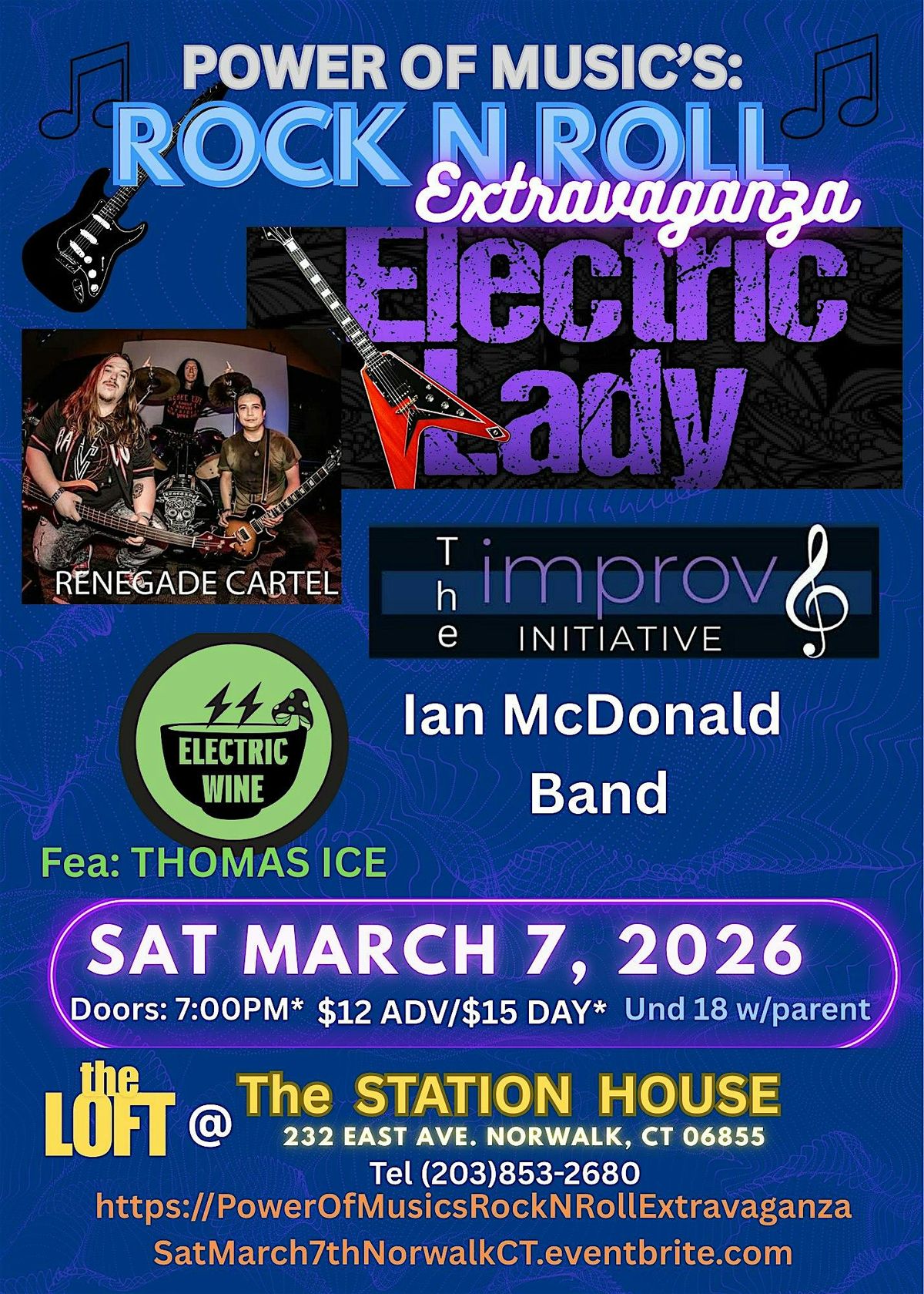 Get ready to jam out in person at the ultimate Rock N Roll music event, featuring: ELECTRIC LADY, RENEGADE CARTEL, ELECTRIC WINE (featuring: THOMAS ICE), THE IMPROV INITIATIVE, and IAN McDONALD BAND. ! This electrifying event is all about the raw energy, iconic riffs, and timeless vibes that only live music can bring. Great food and drink specials, all night, from The Station House, Norwalk CT. Don't miss out on a night packed with epic tunes, great company, and unforgettable memories. Come rock with us!