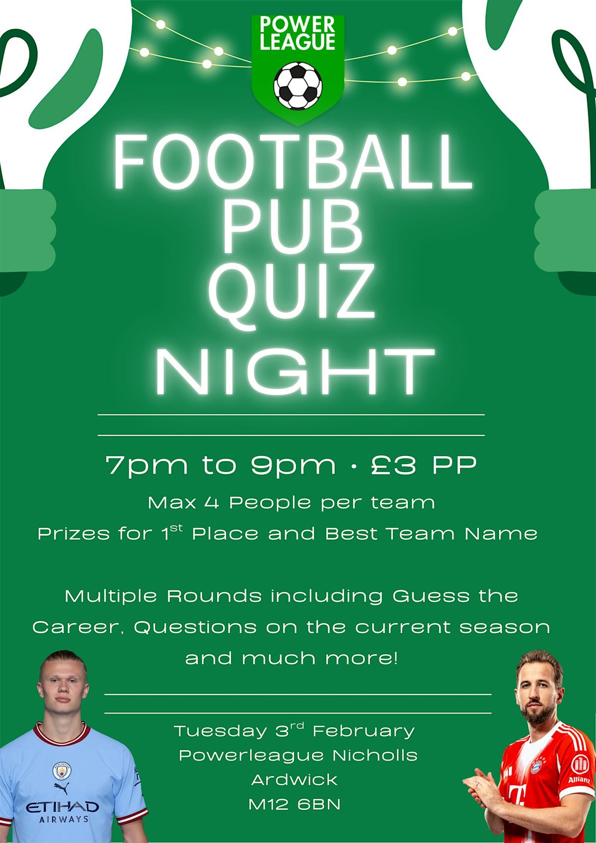 Ready to kick off a fun night? Join us in person for the Powerleague Football Pub Quiz Night! Brush up on your football trivia, challenge your mates, and enjoy a buzzing atmosphere. Whether you're a football fanatic or just in for a good laugh, this night is all about great vibes and cheering for your team. Multiple rounds including Guess the Career, Iconic Celebrations and Guessing the Badges...Plus much more!