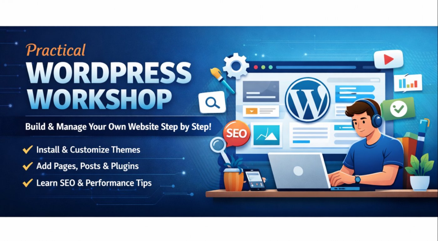 The Practical WordPress Workshop is a hands-on training session designed to help participants build, manage, and launch a professional website using WordPress. This workshop focuses on real-time implementation rather than theory, allowing attendees to create their own website step-by-step during the session.