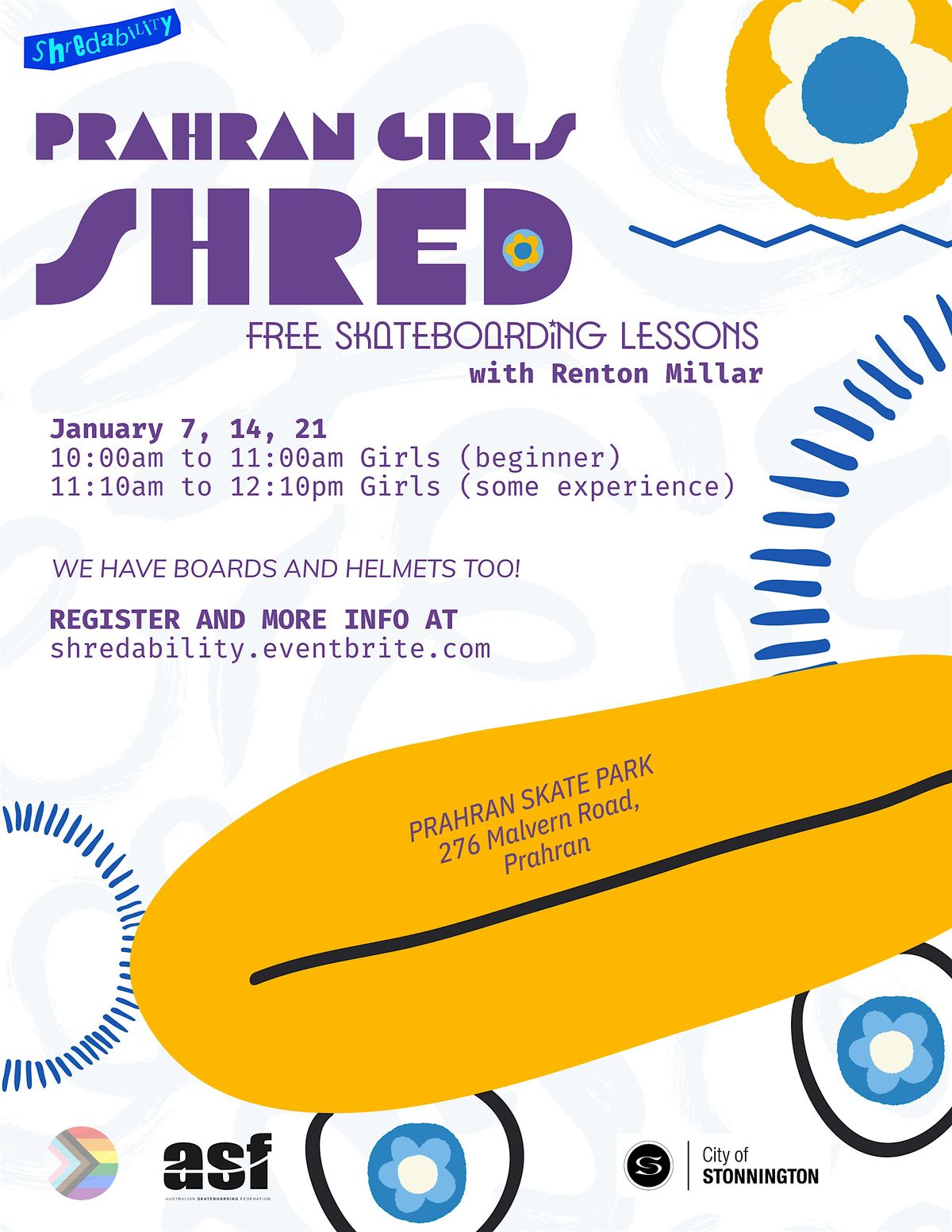 As a result of the success of our last girls program at Prahran, Shredability has FREE Skate Lessons for GIRLS coming up at PRAHRAN Skatepark, Proudly Supported by City of STONNINGTON and SHREDABILITY!
