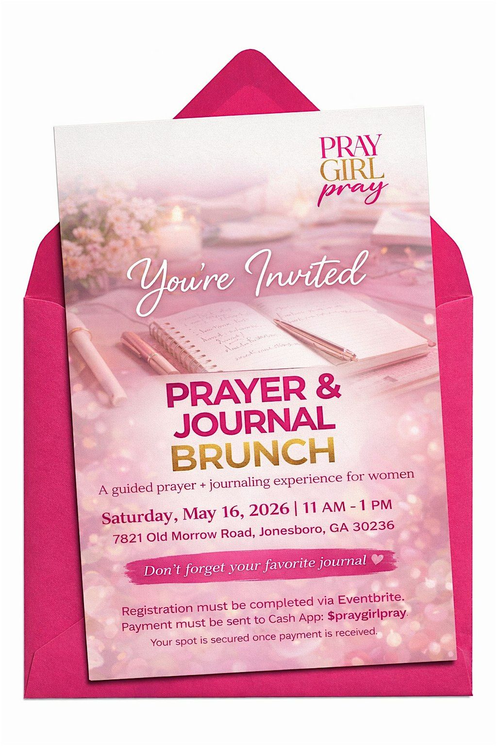 Join us in person for a cozy morning of prayer, journaling, and good vibes! This is your perfect chance to connect, reflect, and nourish your soul alongside a community of like-minded ladies. Bring your favorite journal, grab some brunch, and let's pray together in a relaxed and welcoming atmosphere. Don't miss this uplifting and fun event!