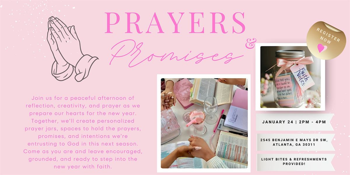 Prayer & Promises is a Christian faith-centered gathering designed to help you slow down, seek God, and prepare spiritually for the year ahead. During this intimate experience, you’ll create a personal prayer jar, a sacred place to store written prayers, scriptures, praises, and moments of surrender as you walk through the new year with God.