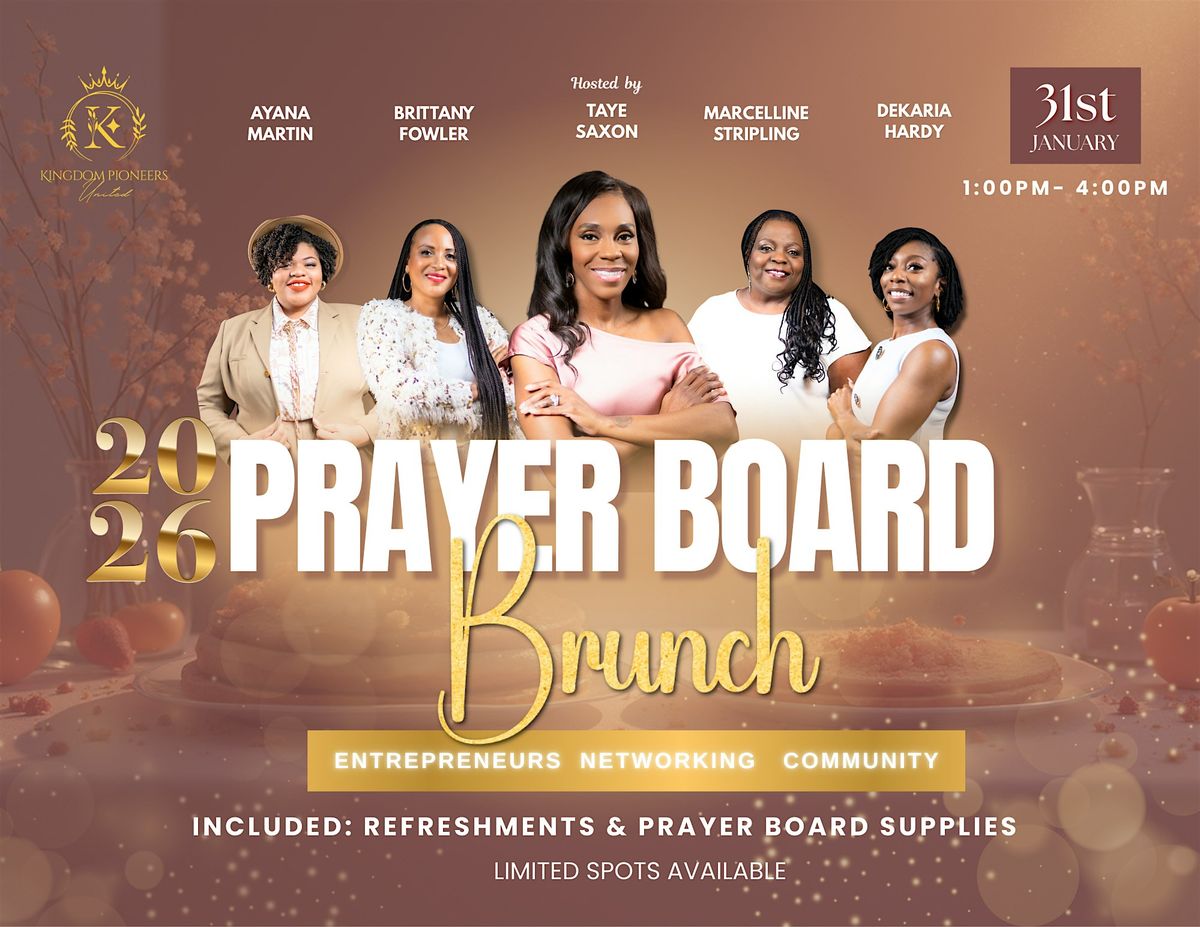 The Prayer Board Brunch is an intimate and faith-centered gathering designed to help you align your vision with God’s purpose for your life in the year ahead. This experience brings together prayer, creativity, and meaningful connection in a peaceful, uplifting atmosphere.