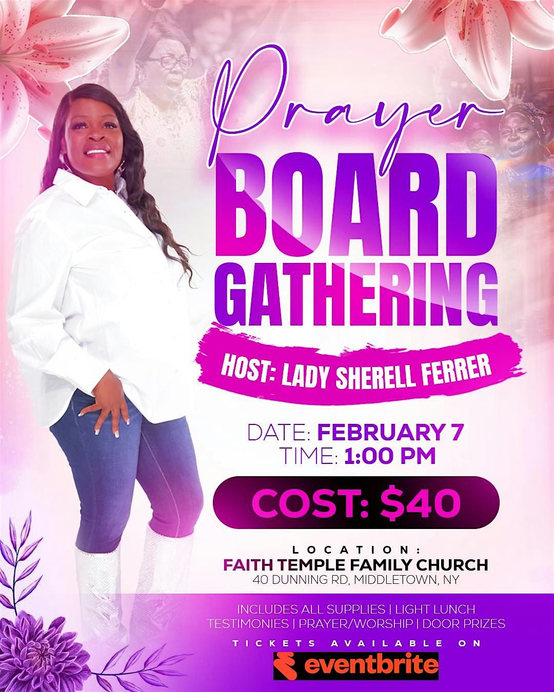 Welcome to the Prayer Board Meeting With Spiritual Growth Workshop happening at Faith Temple Family Church on February 7, 2026 at 1:00 PM (Eastern Time). Join us for a day filled with prayer, reflection, and spiritual growth. This event is designed to help you deepen your connection with your faith and strengthen your relationship with God. Come ready to engage in meaningful discussions, share your thoughts, and learn from others while we create Prayer Boards. Lunch will be served and worship will fill the room. Let's come together as a community to support each other on our spiritual journeys. See you there!
