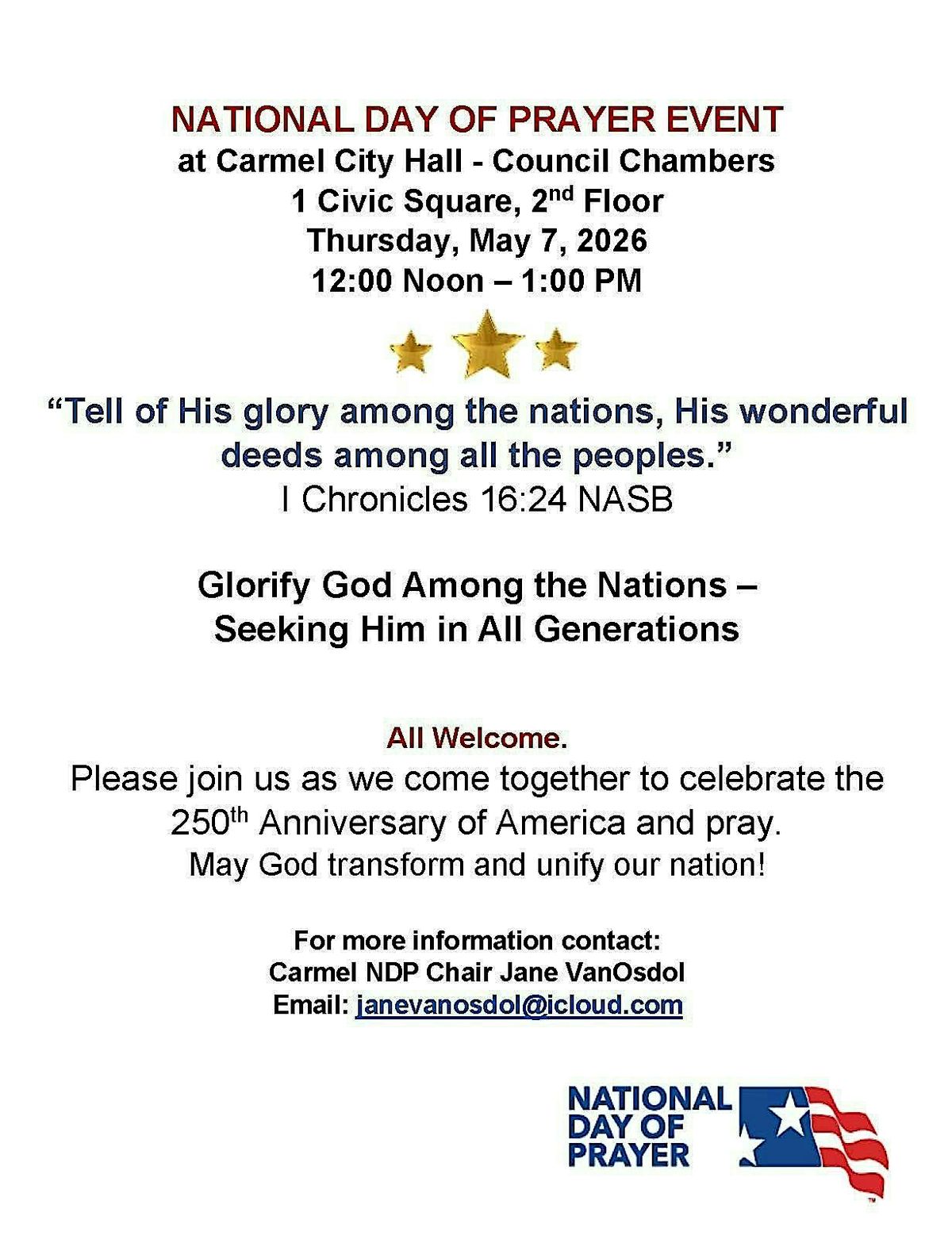 National Day of Prayer gathering at Carmel City Hall on Thursday, May 7, 2026 at 12:00PM in Carmel, Indiana. All are welcome, join in prayer