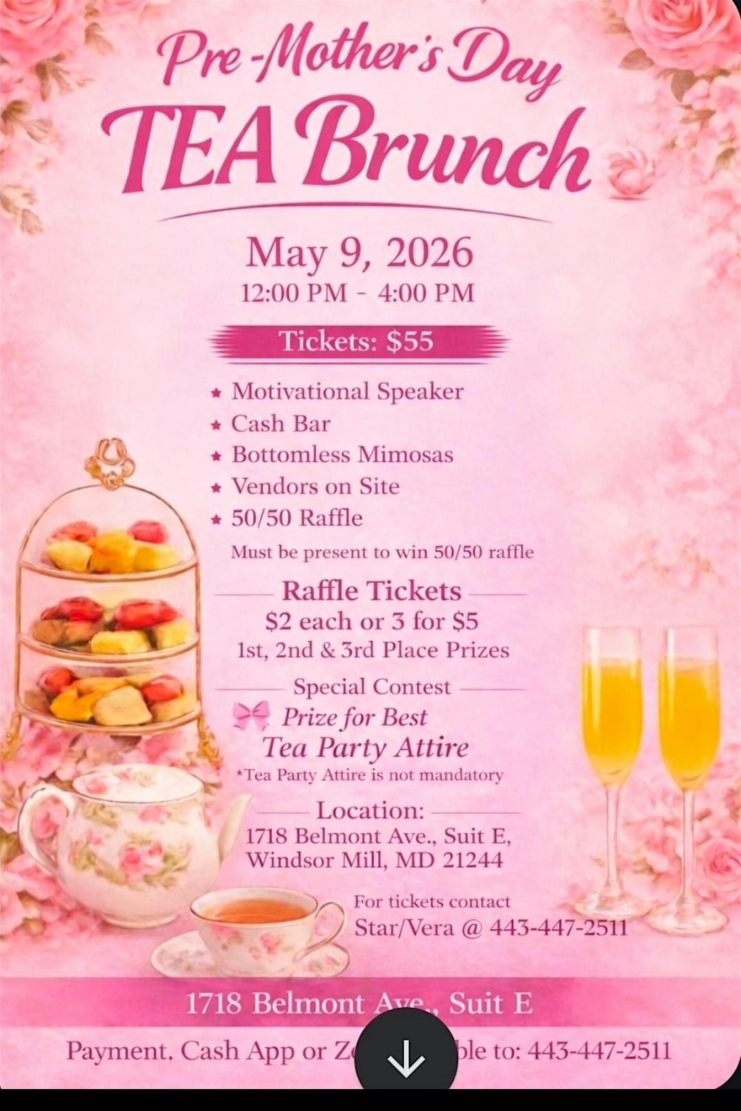 Come out and enjoy pre Mother's Day TEA brunch bottomless mimosas, entertainment, food vendor