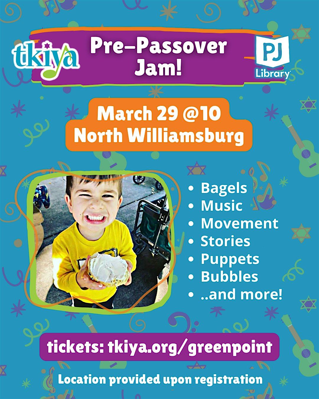 Join Tkiya and PJ Library to learn about Passover and get in some last minute bagels! There will be music, stories, crafts, bubbles, and more. Best for ages 0-5 and their families!