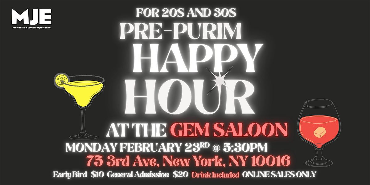 Come join us for a fun evening of drinks, snacks, and good company at The Gem Saloon! This event is specially curated for those in their 20s and 30s looking to kick off the holiday season in style. Whether you're looking to meet new people or catch up with old friends, this is the perfect opportunity to celebrate together. Don't miss out on this chance to enjoy some Pre-Purim festivities with us!