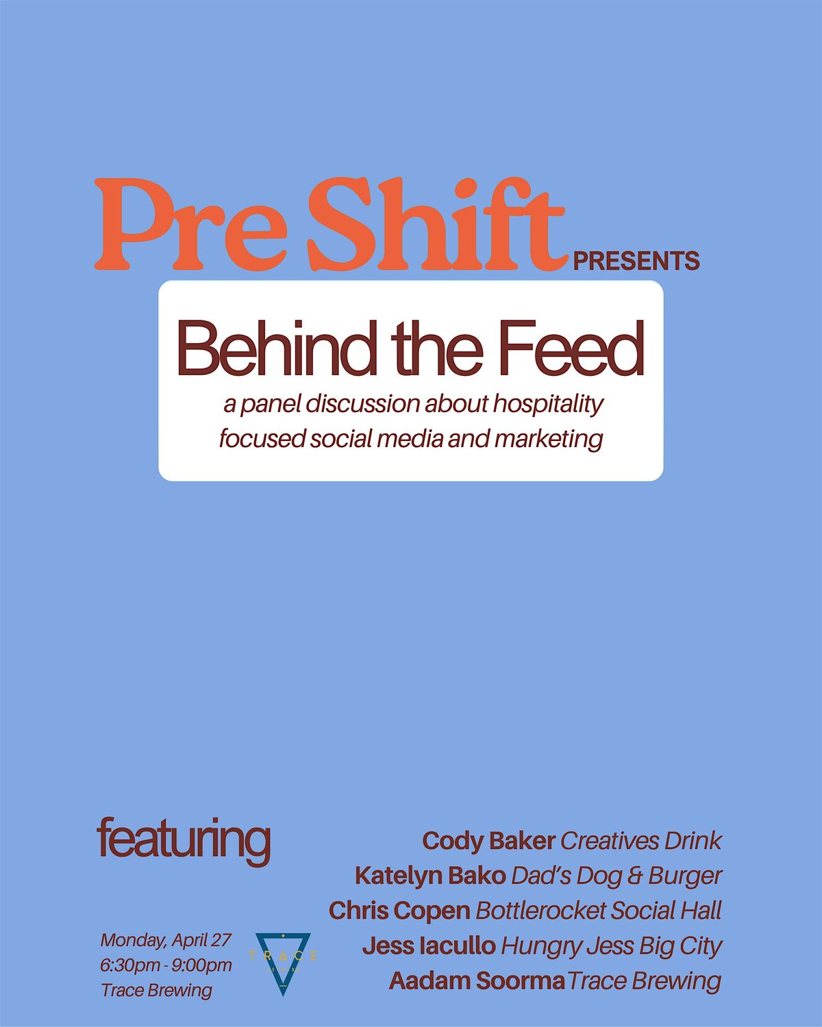 Pre Shift has gathered Cody Baker (Creatives Drink), Katelyn Bako (Dad's Dog & Burger), Chris Copen (Bottlerocket Social Hall), Jess Iacullo (Hungry Jess Big City), and Aadam Soorma (Trace Brewing) to share their knowledge and engage in a conversation about authenticity and storytelling through social media, marketing, and branding.