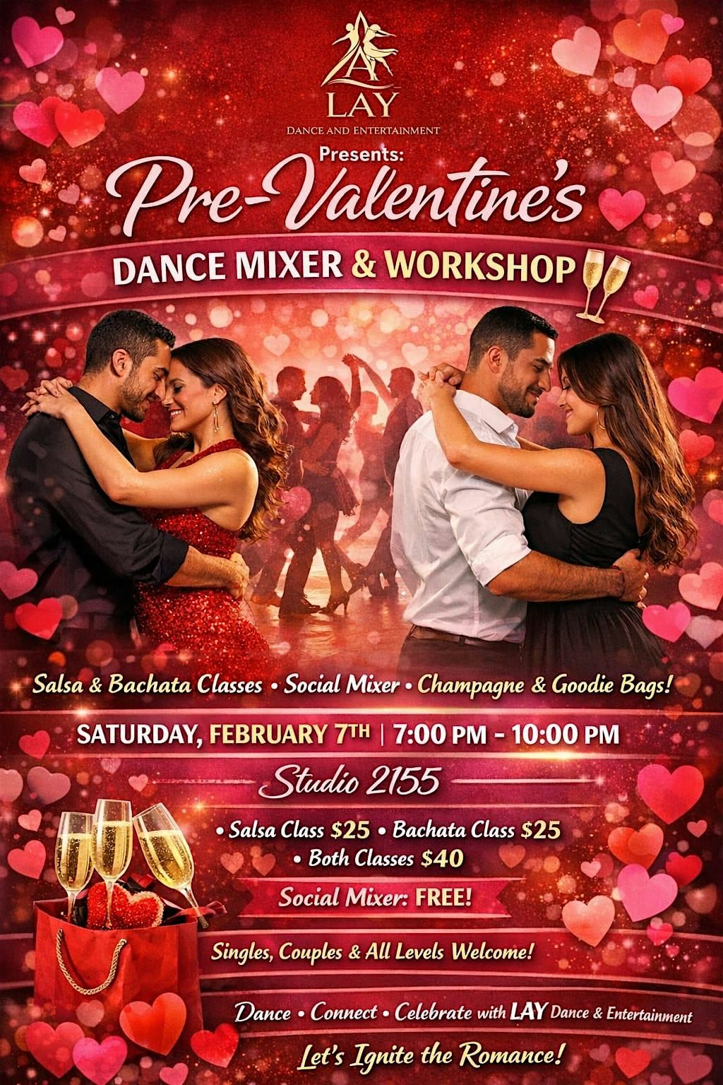 Whether you’re single, dating, or coupled up, LAY Dance & Entertainment invites you to an unforgettable Pre-Valentine’s Day Mixer & Latin Dance Workshop. The perfect way to connect, move and celebrate before Valentine’s Day.