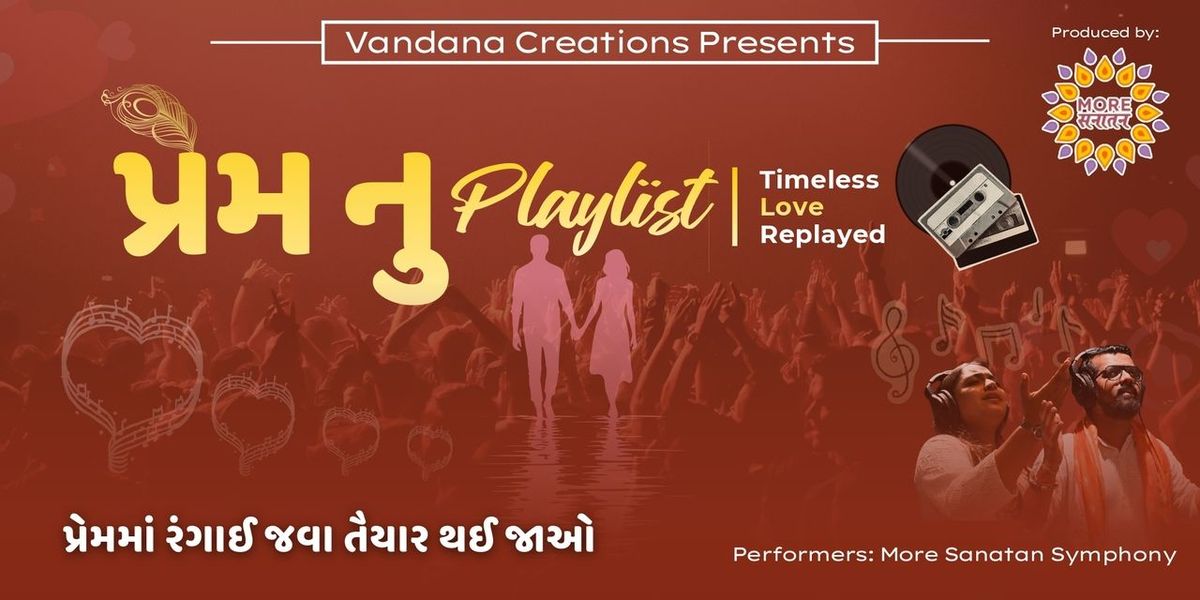 Prem Nu Playlist is a live Gujarati musical and dance experience presented by More Sanatan by Vandana Creations. The show celebrates love and human connections through Indian culture, literature, and timeless music. The performance blends Gujarati Sufi, Lokgeet, and traditional Gujarati and Hindi folk songs, brought alive through soulful live singing and expressive dance performances. Curated as a complete audio-visual experience, Prem Nu Playlist offers audiences an evening of meaningful lyrics, rich melodies, and cultural storytelling.