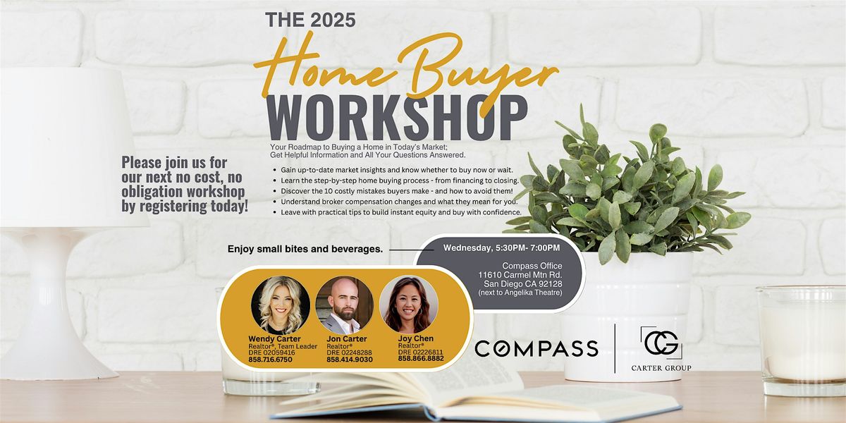 DRAFT MODE > > > > Hosted by the Carter Group with Compass, you are invited to join us for a no-pressure, info-packed event where you can get a roadmap to buying a home in today’s market, get insider tips, and learn 10 mistakes to avoid. Whether you're a first-time buyer, downsizing, upsizing, or looking to invest, this seminar is designed to give you clarity, confidence, and a clear action plan.