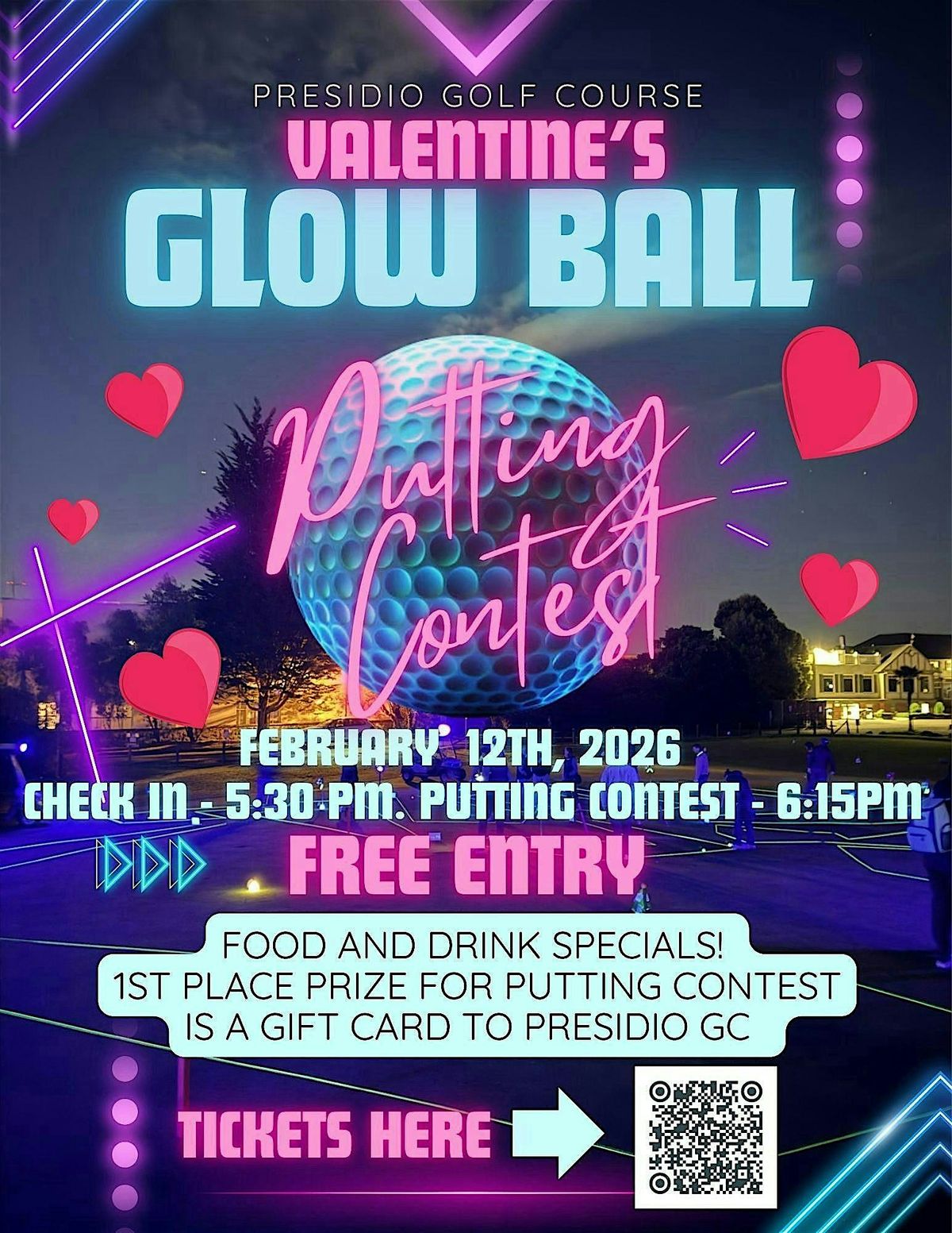 Welcome to the Glow Ball Putting Contest at The Presidio Golf Course! Get ready for a fun evening of glow-in-the-dark putting under the stars. Join us on THURS FEBRUARY 12, 2025 at 5:30 PM at the beautiful Presidio Golf Course for a unique golfing experience. Grab your friends and family for a night of friendly competition and enjoy our unique putting course lit up at night with glowsticks and glow balls. Glow balls will be provided for all contestants. We encourage you to bring your own putter if you have one but can provide a putter for you if need be. Following the contest we will meet in the clubhouse for prizes, and food and drink specials. Don't miss out on this exciting event!