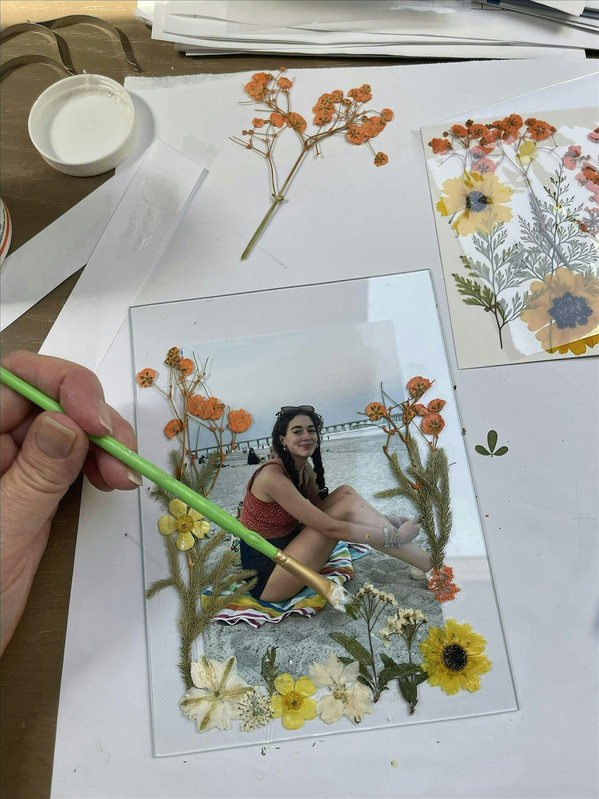 You will learn to artfully arrange already pressed, dried flowers of your choosing in a gorgeous gold rimmed, double paned glass frame. Choose to create your initial, frame a picture or make your own design! A beautiful reminder of summer on your office desk, mantel or window sill to keep your mood bright and sunny!