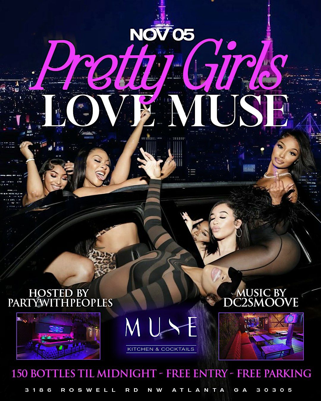 Come join us for a night of fun, fashion, and music at Muse ATL! This in-person event will be held at 3186 Roswell Rd NW, so mark your calendars. Get ready to dance, mingle, and enjoy the company of other pretty girls who love to have a good time. Don't miss out on this opportunity to make new friends and memories. See you there!