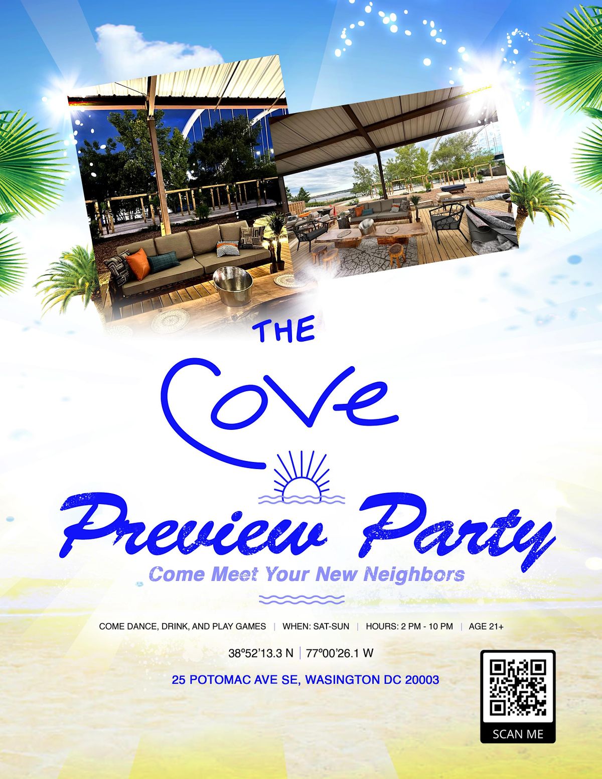 Welcome to The Cove! Be the first to check out this 45,000 sq ft sprawling tropical oasis along the waterfront directly across Nationals Stadium. Lounge the day away with scenic seating, yard games, multiple bars slinging tropical cocktails, and a vibe unlike any in DC.
