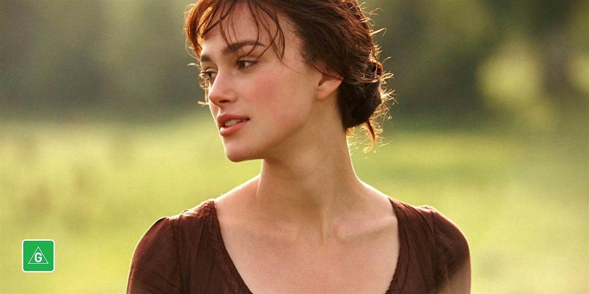 Image: Still shot from Pride and Prejudice shows actress Keira Knightley in a meadow with hair pulled back in a bun. Film classification G.