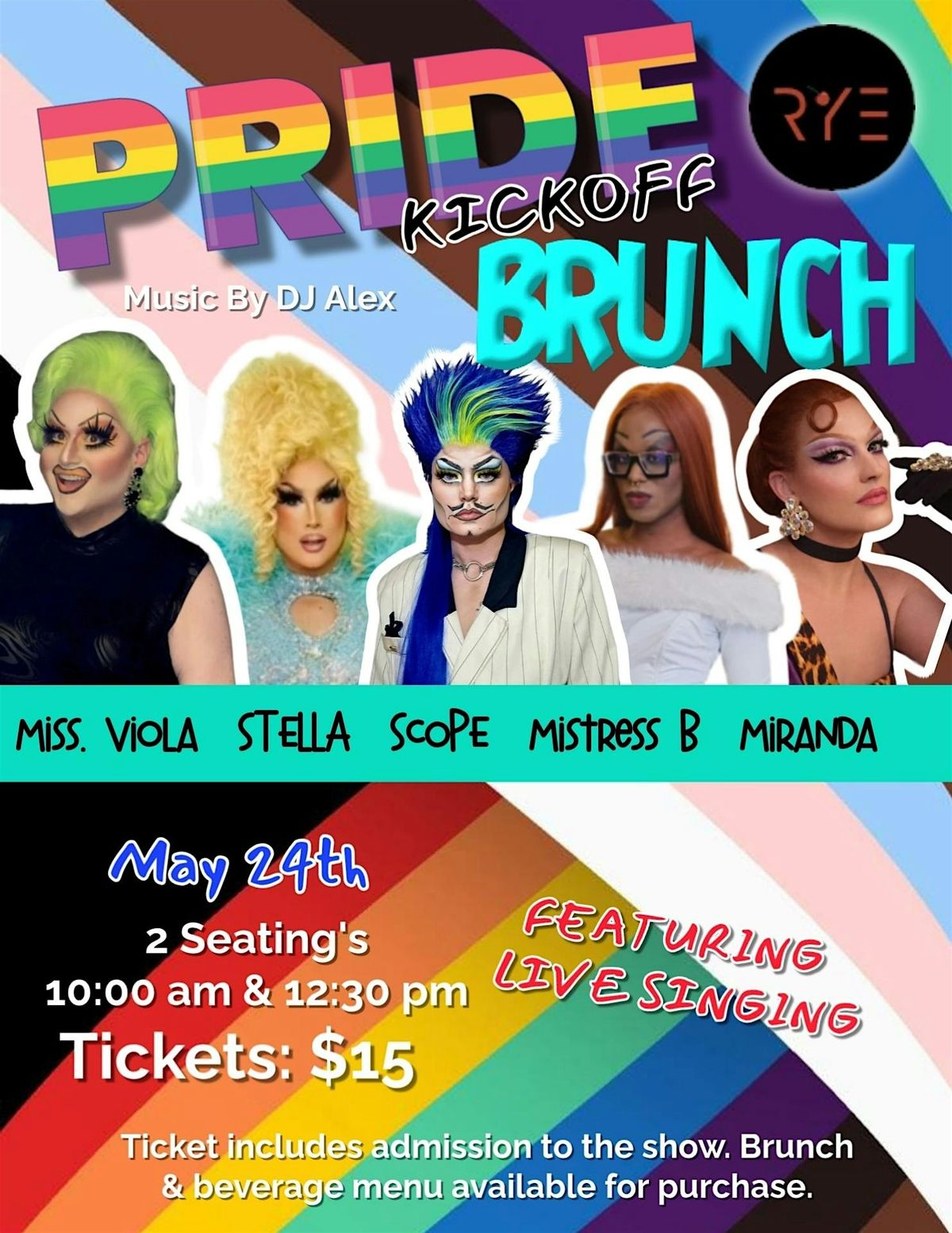 We are back, and we are kicking off PRIDE season in STYLE! Join Miss. Viola as she hosts another incredible drag brunch at Rye Bar and Restaurant! Kick back, enjoy an incredible cocktail and the world famous brunch delites that have made Rye famous!