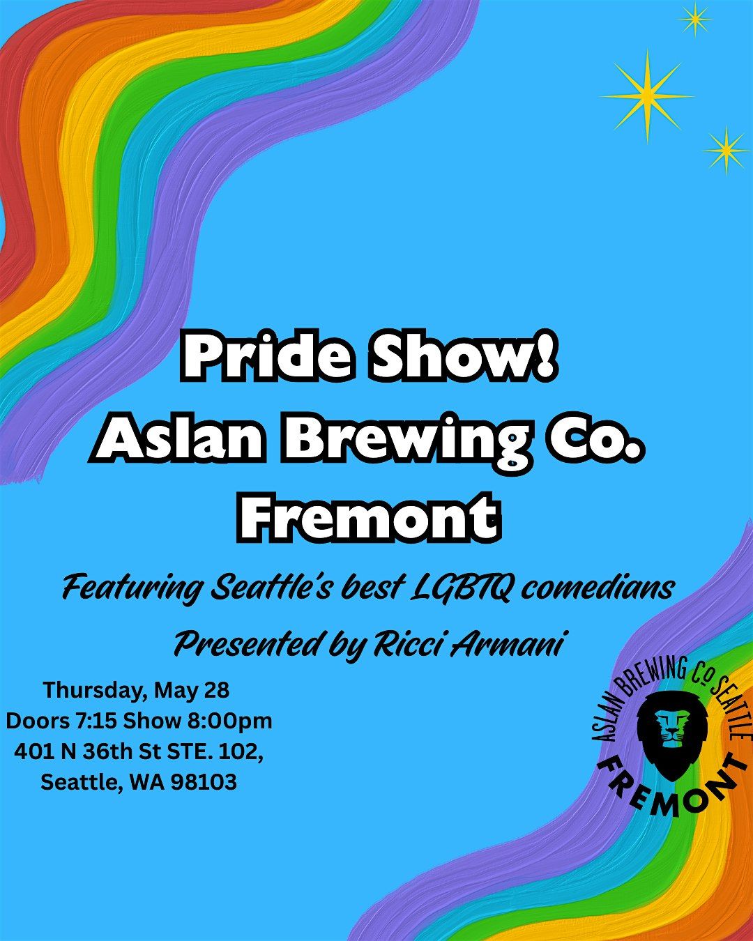 Aslan Brewing Co. is launching their new Pride beer with portions of the proceeds going to NW Queer Youth Services. To celebrate, Aslan is hosting a Pride comedy show featuring some of Seattle's best LGBTQ comedians. Come kick off Pride month with a good laugh thats going to supporting a great cause.
