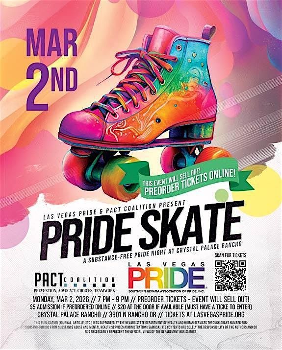 Welcome to Las Vegas PRIDE Skate Night! Get ready to roll into a night of fun, music, and pride at Crystal Palace Rancho. Join us Mon, June 8th, 2026 at 7:00 PM!