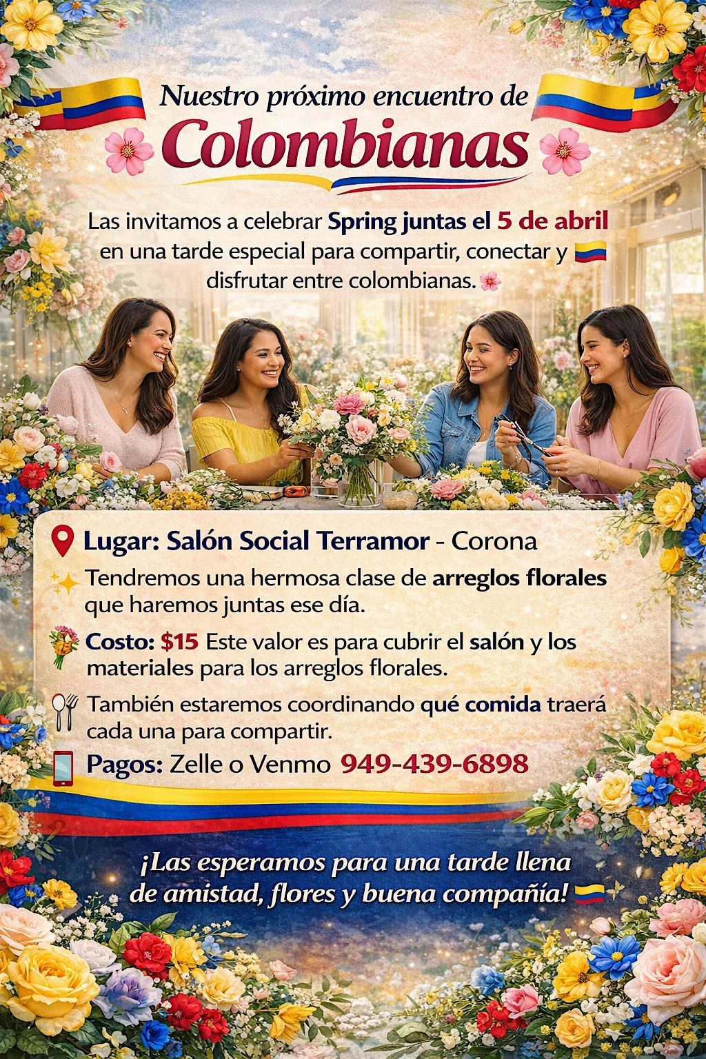 Las invitamos a celebrar Spring juntas el 5 de abril en una tarde especial para compartir, conectar y disfrutar entre colombianas. 🇨🇴